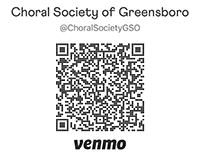 The Choral Society of Greensboro is sponsored by the City of Greensboro through Creative Greensboro. Creative Greensboro provides support for rehearsal space, salaries for our conductor and accompanist, and most of our music without charge. We are very grateful for this generous support! City support alone, however, is not enough for us to perform our major mission: to perform major the major works of choral literature, usually with professional soloists and orchestral accompaniment. Paying these musicians, as well as other incidental costs, requires that we raise a substantial amount of money each year. This is where you come in. Whether you are a Choral Society vocalist, a friend or family member, or simply a citizen who wants to support the performance of major choral works in Greensboro, we welcome your generosity. Contributions to the Choral Society are tax deductible, and donors are recognized in the concert programs, if desired. You can also make a contribution in honor of a member or other person of your choosing. The easiest way to donate is to use this Venmo QR code to donate directly to the Choral Society of Greensboro.